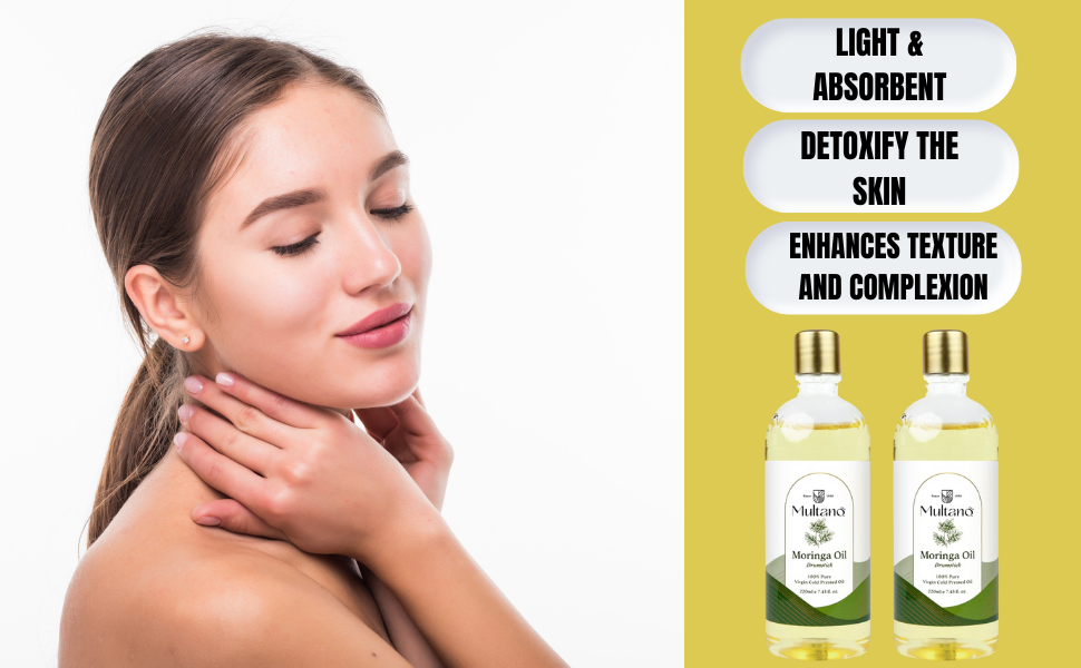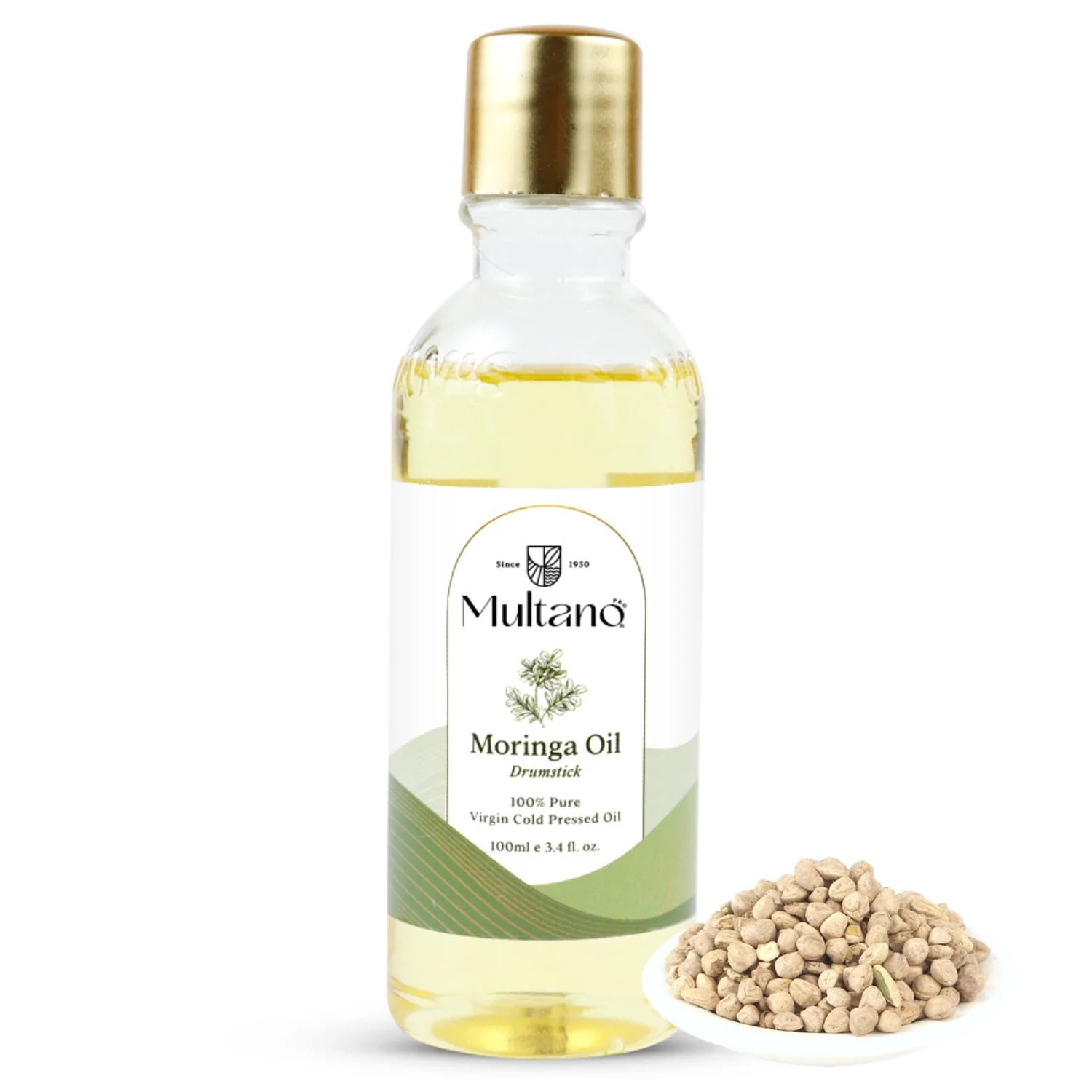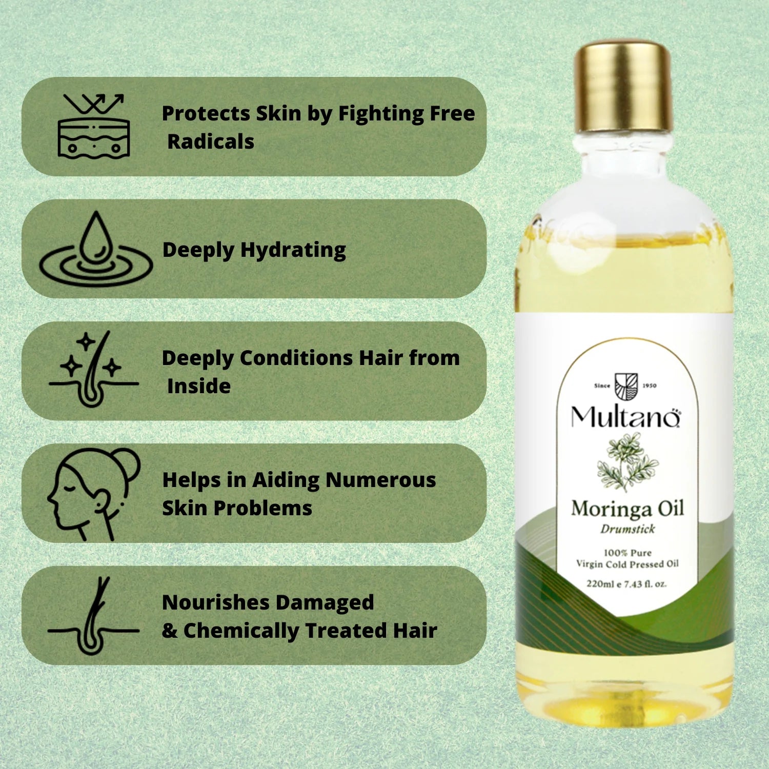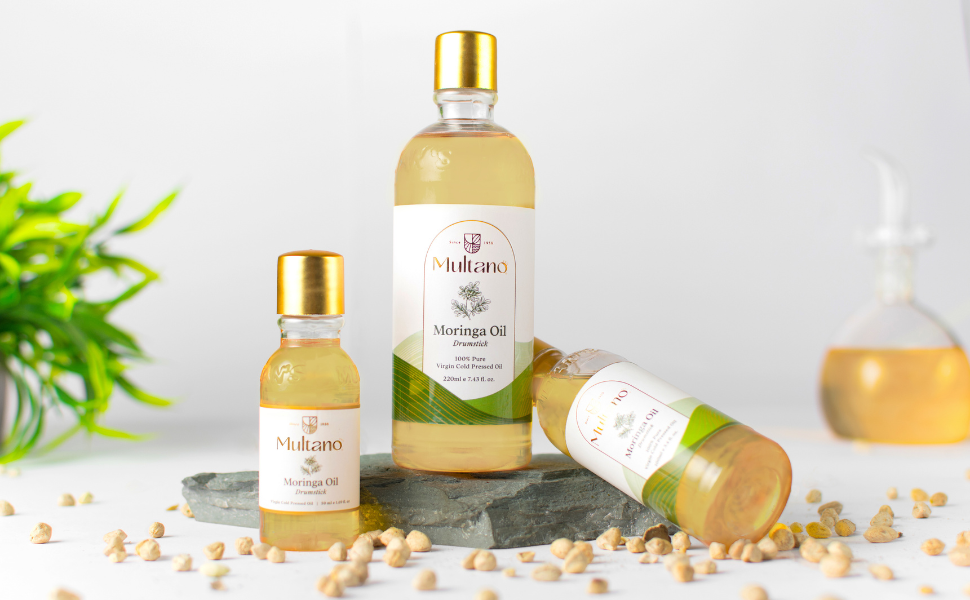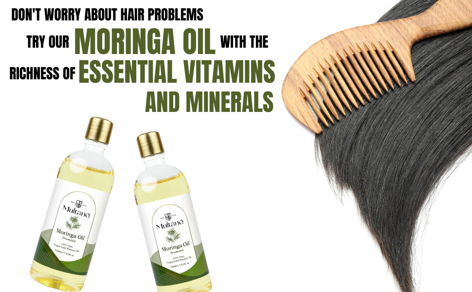 Moringa oil is renowned to deeply condition the hair from the inside. It strengthens hair follicles, promotes healthy hair growth, reduces split ends, nourishes damaged and chemically treated hair. It rejuvenates the hair with essential vitamins and minerals and helps in retaining its original colours.