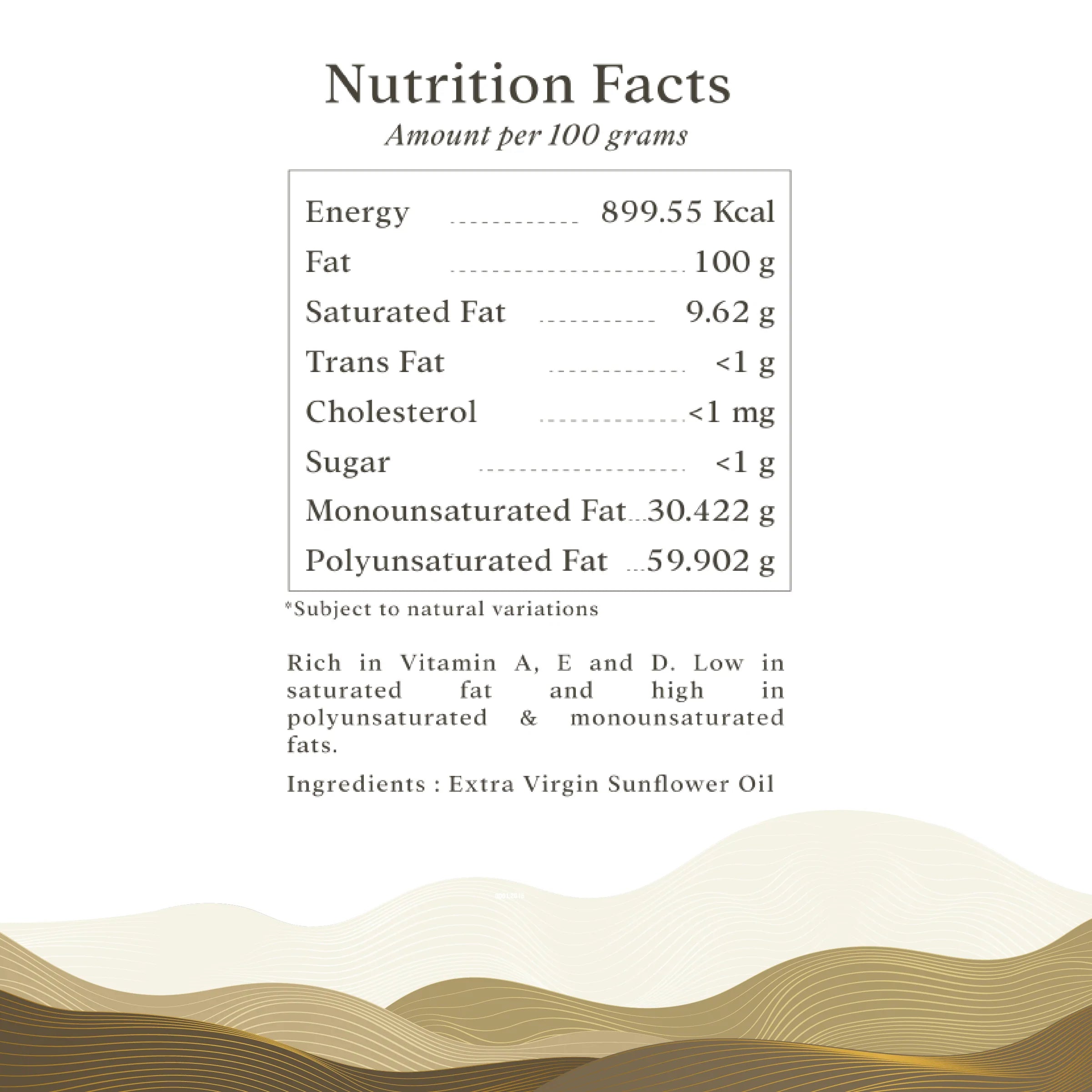 Sunflower oil is the ideal choice of cooking oil for people with cardiovascular, cholesterol and weight management problems. It can be used for cooking, frying and baking and just 5 tablespoons of Sunflower oil in a day are sufficient for maintaining the overall health of an adult.