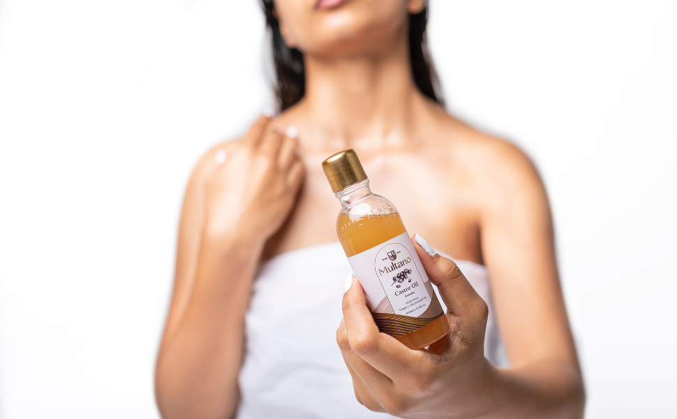 Castor oil is a natural emollient (moisturizer) that is perfect to be used as a massage oil. It remedies dry skin and promotes skin health. Dilute it with any other application oil like olive oil or groundnut oil in a 1:1 ratio before usage for best results.