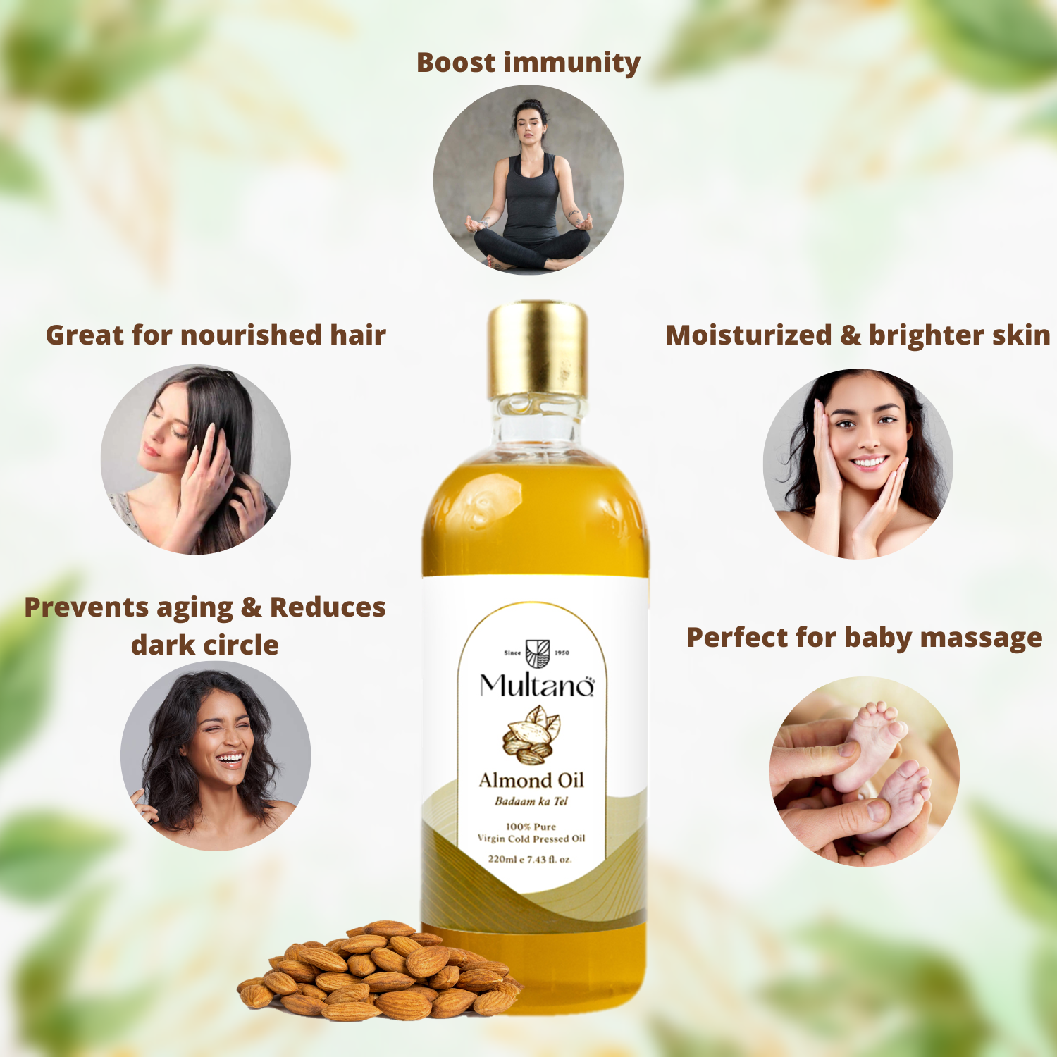 The king of oils, almond oil is a nutritional powerhouse that nourishes and hydrates the entire body. It's a perfect partner and a must have vanity for taking care of your supple and glowing skin as well as for strong and nourished hair. Experience the true luxury of supple skin, beautiful locks and nourished body with Multano Almond Oil.